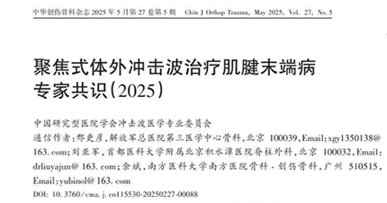 聚焦式ESWT最新专家共识!近日,《聚焦式体外冲击波治疗肌腱末端病专家共识(2025)》发布,该共识由中国研究型医院学会冲击波医学专业委员会撰写,旨在规范聚焦式体外冲击波(fESWT)在肌腱末端病治疗中的应用。“ESWT是临床骨肌疾病领域广泛应用的一种非侵入性且安全有…