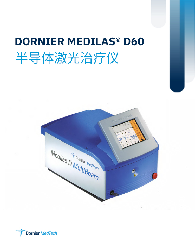 Dornier Medilas®D60设计经典,安全可靠。波长940纳米(标称功率60瓦,峰值功率8OW )具备最佳血红蛋白和水的吸收率,可广泛应用于多种临床微创治疗。具备两种激光发射模式∶连续发射和脉冲发射,可进行切除、凝血、消融和汽化等不同微创手术方法。